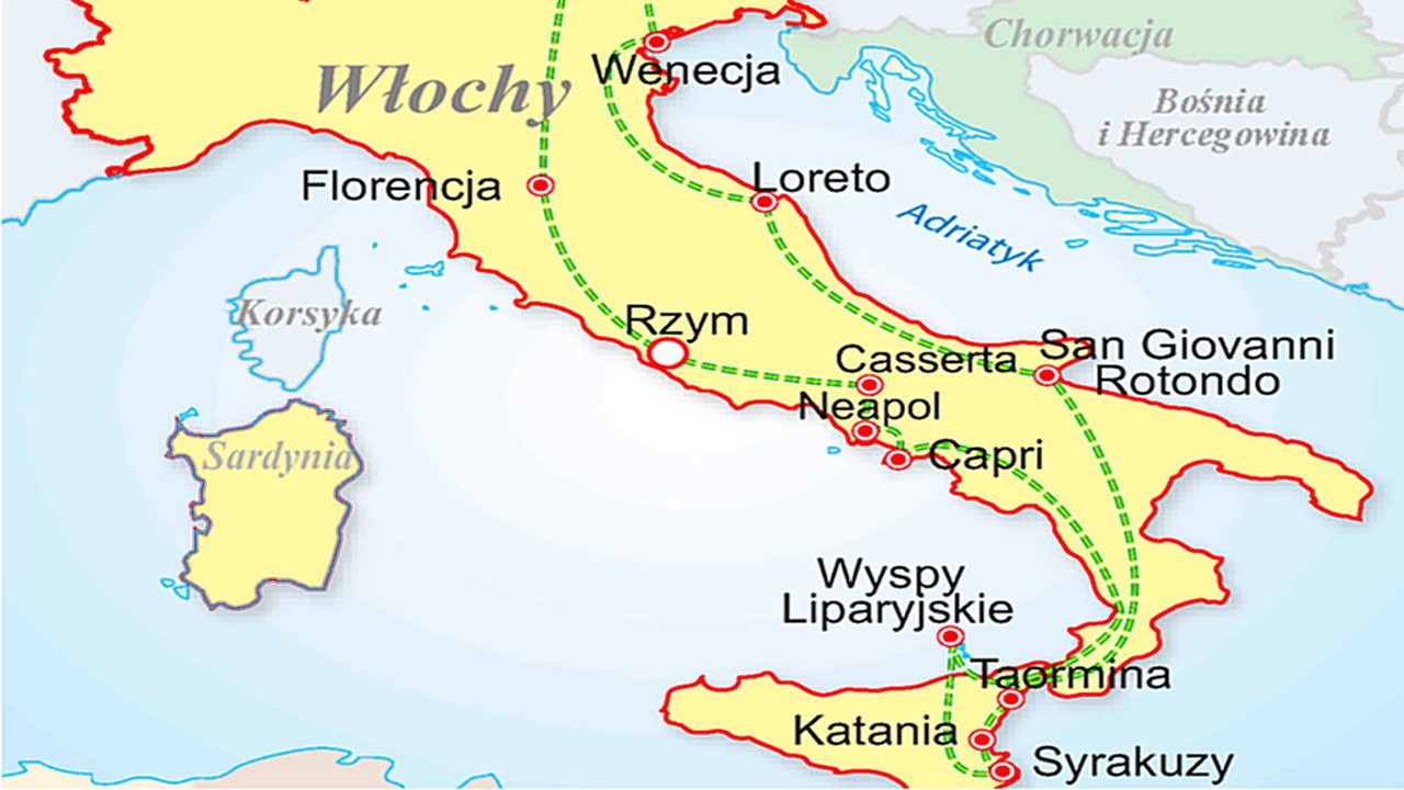 - Zakwaterowanie: 12 noclegów w hotelach ***. Funkcjonalnie wyposażone pokoje 2, 3 os. z łazienkami. 1 nocleg tranzytowy w okolicy Treviso, 1 nocleg w okolicy Rimini, 1 nocleg w okolicy Bari, 4 noclegi na Sycylii w okolicy Katanii/Taorminy, 2 noclegi w okolicy Neapolu, 2 noclegi w okolicy Fiuggi, 1 nocleg w okolicy Chianciano Terme.