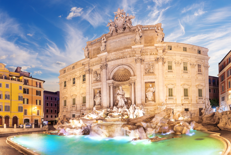 - Fontanna di Trevi – jedna z najbardziej znanych we Włoszech oraz na całym świecie, ma ok. 26 m wysokości i 20 m szerokości,