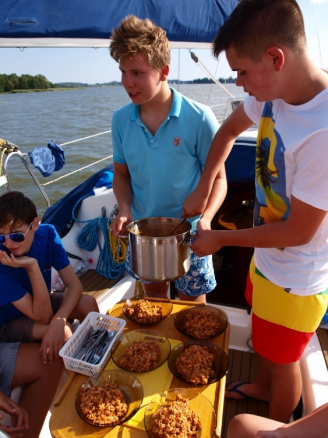Trzy posiłki dziennie + podwieczorek przygotowywane w kuchni jachtowej siłami załogi – z pomocą wychowawcy i sternika – z produktów zakupionych przez organizatora. Załoga będzie sama robić listę zakupów, a my zadbamy o to, aby posiłki były zdrowe, smaczne i pożywne.